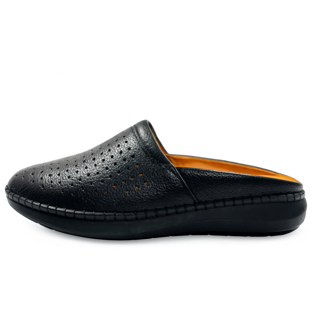 ساختهشده با رویه چرم گاوی طبیعی و استری داخلی از چرم بزی برای حس نرمی و دوام بیشتر. طراحی رویه بهگونهای انجام شده که هوا بهراحتی در صندل جریان پیدا کند و پا همیشه در حال تنفس بماند. این مدل دارای کفی قابلجداشدن و یک کفی مهندسیشده است که قدمزدن را سبک، راحت و بدون خستگی میکند